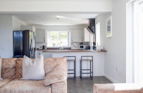 "One Mill Ends", 5-room cottage on 2 levels. Spacious and bright, comfortable and tasteful furnishings: open living room with dining table, TV, flat screen, DVD and wood-burning stove. Exit to the garden, to the patio. 1 double bedroom with 1 double bed, shower/WC and TV (flat screen). 1 room with 2 beds, shower/WC and TV (flat screen). Open kitchen (5 hot plates, oven, dishwasher, microwave, freezer) with dining table. Exit to the patio. Bath/shower/WC. Heating. Upper floor: 2 double bedrooms, each room with 1 double bed, shower/WC and TV (flat screen). Mezzanine. Heating. Beautiful view of the bay. Facilities: washing machine, dryer, children's high chair, baby cot for up to 2 year olds. Internet (WiFi, free). E-charging station. Please note: non-smoking house. 2 pets/ dogs allowed. There are 2 single guest beds available to book to accommodate 10 pax.