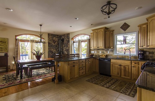 Surround yourself with nature. Our luxury house is located in private Emerald Lakes community complete with pools, lakes and beaches. Our home is beautifully decorated with a rustic theme to truly make it your home away from home. There is a fully equipped kitchen with granite countertops, reverse osmosis water filtration system and brand new appliances. A beautiful dining room with potbelly stove, living room with propane fireplace awaits you. There are four bedrooms, one with a king bed, two bedrooms with queen beds, a 'kid's' bedroom with 2 twin bunk beds (4 beds) and a study with a bunk bed with a full and twin bed.. Three full baths with tub and showers. In the newly renovated basement, there is a washer and dryer, pool table, ping pong, and foozball tables. The basement has a large TV room with a DVD player and cable TV. Two wrap around porches offering beautiful panoramic views surround the one and half acre peninsula property.