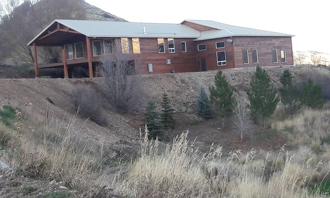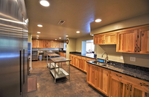 The Lodge is 10,000 sq feet, has a huge kitchen with tons of storage, 2 great rooms for large groups gatherings and all the amenities of home. The kitchen is fully equipped with all the amenities of home. The only items you need to bring are plates, cups, eating utensils and FOOD! It has granite countertops, side by side refrigerator/freezer, 2nd huge commercial fridge, two ovens and two gas stoves. 2 microwaves, Commercial grade ice maker & 6' x 8' pantry shelving for storage of dry goods. We also have chairs and tables to accommodate 100+ people. The lodge sits approximately 1/4 mile from the paved road, 4 minutes from the freeway exit and is quite, safe, and very private, as it sits in the middle of a private working ranch. Perfect for your kids to play without the dangers of traffic and people.