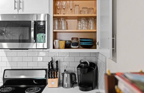 Our newly renovated 1-bedroom home features a comfortable bed with hotel sheets (read the reviews about the mattress), a queen pull-out couch, and an additional rollaway bed stored in the master bedroom closet. The bathroom includes a shower and hotel-quality towels and linens. You’ll find a fully equipped kitchen with fridge/freezer, oven and stove, microwave, toaster oven, coffeemaker, and high-speed WiFi (500 MB) throughout—ideal for remote work.