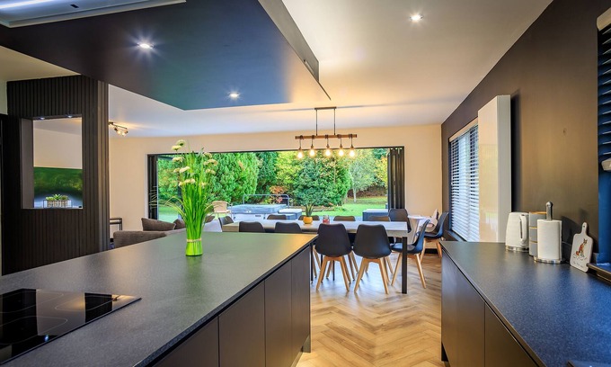 > Huge hosting area with brand new kitchen, dining table that seats 12 and a sofa/snug area with 65 inch TV