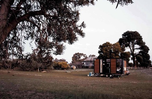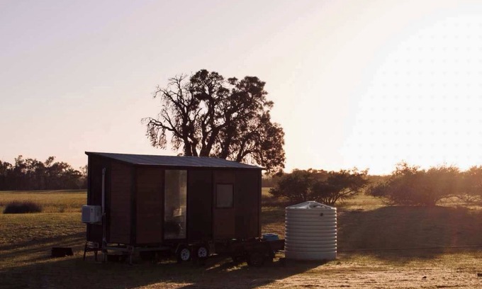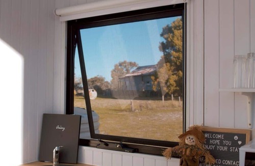 The tiny house is conveniently positioned near the original farm shearing shed, constructed in the 1920s, and the current yards. Nestled within a paddock atop a sandy hill, it offers sweeping views of open grazing land and native bush, stretching 700 meters to the north and west from its deck.