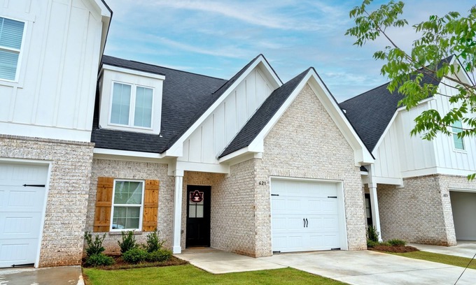 This gorgeous new townhome in Auburn with an open floorplan and cozy beds is perfect for your next trip to your favorite college town. The single level townhome connects a full kitchen with a breakfast bar, laundry closet, dining room, and great room for a functional gathering space. The primary bedroom with a king-sized bed features an ensuite bathroom with a double vanity, walk-in shower, and spacious closet. The second bedroom with queen-sized bed is located at the front of the home away from the primary suite for privacy. A hall bathroom is available for guests staying in the second bedroom and for easy access from the living spaces. The covered patio is perfect for winding down after a busy day in town!