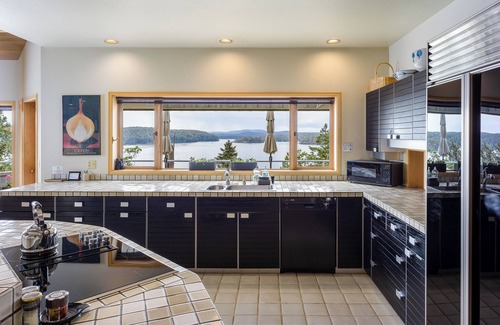 Just a convenient mile from the ferry landing, this dramatic contemporary home offers wonderful end-of-the-road privacy. Almost every room of this wonderful vacation home on Orcas Island offers spectacular views across West Sound, Shaw Island, and Wasp Passage. The sunsets will take your breath away. This is a spacious, high bank waterfront home, with a fabulous patio and deck stretching across the western side. It is a great space for watching summer boat traffic travel up West Sound to the marina.
