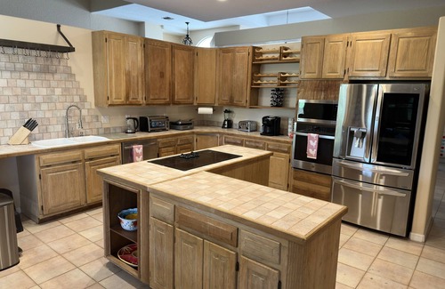 The family room connects with the kitchen/breakfast area. This space includes a TV mounted above the fireplace and 2 memory foam pullout sleeper sofas that can comfortably sleep 4 guests.