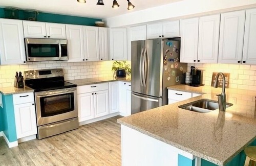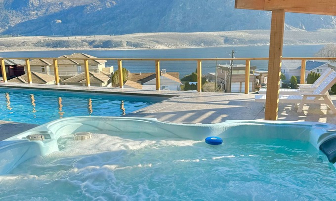 This Newly Reno'd 1200 soft 2 bed 1 bath suite with private pool and hot tub is a 4.5 minute walk to the beach. Quartz counter tops, stainless steel appliances. Quiet dead end street relaxing neighborhood within walking distance to town/ popular beaches/ free boat launch. Enjoy views of the lake around the outdoor fire pit while reading a book or having your morning coffee. Ample parking for your boat. Amazing friendly area to take a stroll or just sit around the pool and enjoy the sunshine and weather Osoyoos is famous for!