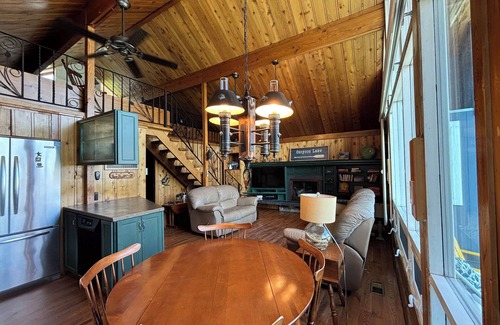 Our cabin includes stainless steel kitchen appliances, linens, BBQ, king bed in master bedroom, loft with lake view and Queen with two single beds, private beach and boat dock.