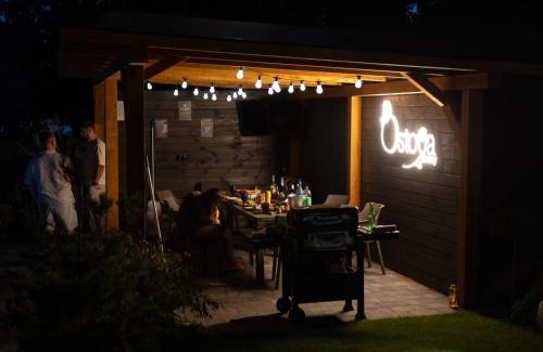 Providing pool views, Ostoya Zawory -domki premium, strefa relaksu, basen in Zawory features accommodations, a private beach area, a seasonal outdoor swimming pool, a garden, and barbecue facilities. With garden views, this accommodation offers a balcony. The villa provides rooms with air conditioning, free private parking, and free Wifi. The villa provides guests with a terrace, lake views, a seating area, satellite flat-screen TV, a fully equipped kitchen with a dishwasher and an oven, and a private bathroom with walk-in shower and a hair dryer. A microwave, a fridge, and stovetop are also featured, as well as a coffee machine and a kettle. At the villa complex, all units include bed linen and towels. Guests can also warm up near the outdoor fireplace after a day of cycling. Train Station is 23 miles from Ostoya Zawory -domki premium, strefa relaksu, basen, while Gdansk Zaspa is 25 miles away. Gdańsk Lech Wałęsa Airport is 18 miles from the property.