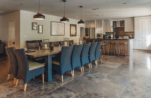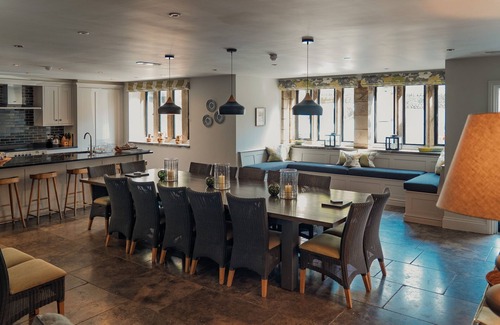 Oughtershaw Hall's well-equipped kitchen is vast. Open-plan and L-shaped, the spacious breakfast bar or an impressive dining table can seat your entire party. While in quieter moments, the built-in window seats provide restful views out to the garden.