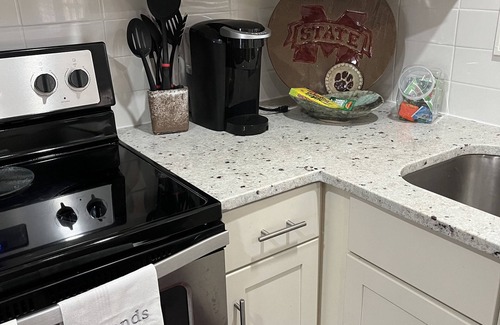 You want close, you got it! Walking from our condo Davis Wade Stadium, the Hump and Dudy is eight tenths or a mile; 1.1 mile to Nusz Park, and track/field. Less than 2 minutes to be on campus!. It is fully furnished with 2 bedrooms with ensuites, a king sofa bed with a half bath in the hallway, and free wifi perfect for a six-person stay. Our kitchen is stocked with all kitchen needs, a Keurig/coffee maker, and a refrigerator with an ice maker. There is a grill and outside seating. Two reserved parking spaces are available. Our back porch is a great place to start or day or end it.