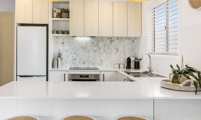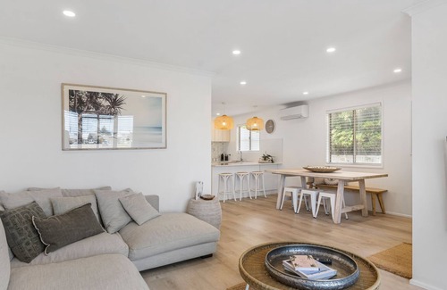 The open concept living space has a comfy lounge with a TV for those cosy movie nights in, and heating provided for those chilly seaside evenings. Fresh off the sand? Our Washing Machine has got you covered!