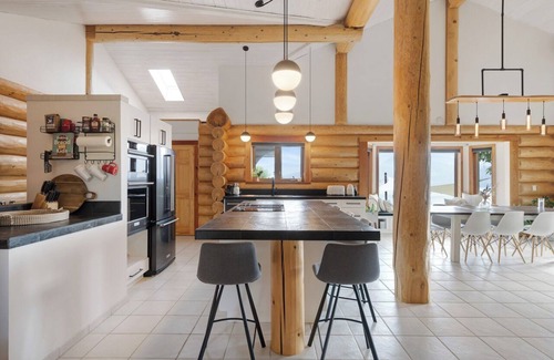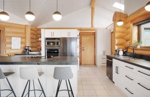 This modern home feels nothing like your traditional log cabin. With an open floor plan, vaulted ceilings, great bedroom separation, and several multi-purpose rooms, you will find the space perfect for larger groups. The spacious kitchen makes nightly feasts a breeze, the outdoor wet bar makes for fantastic days by the pool, and the fire pit area is perfect for watching sunsets. The home is set-up with a dry sauna, gym, Peloton, ping pong table, bocce, a plethora of board games, and a take-a-book-leave-a-book library. And yes, we have pool floaties for you.