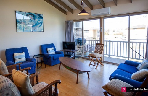 The sun-filled living area is comfortably fitted out with a television and seating for all the family.