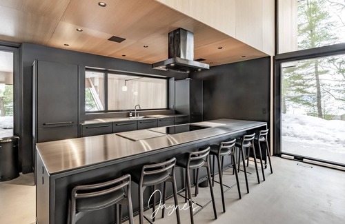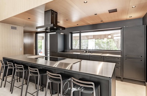 State-of-the-art kitchen boasting an induction stove top, 2 dishwashers, 2 skinny fridges (one has a small freezer drawer). A beautiful island features a Miele oven and Miele convection microwave with 6 bar stools.