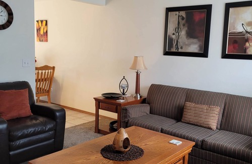 The living room is furnished with a reclining couch, accent chair for encouraged relaxation and a desk and office chair for business or social media needs. You can also watch movies on a 55” smart TV with blue ray player, Netflix or stream your favorite movies via our free Wi-Fi, now it’s time to relax and enjoy. The dining room is open to the kitchen area. The kitchen is fully stocked with spices/herbs, cookware and dinnerware everything you may need is provided. Just grab your groceries and you’re set to prepare your favorite home cooked meals. There is a laundry facility in the unit and we supply basic laundering supplies.
