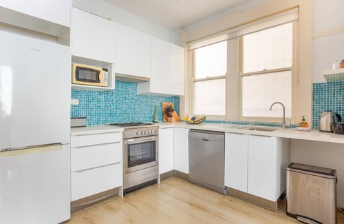 Inside, this charming apartment has an oversized layout with spacious open plan living and dining. Kick back on the sofa and unwind with cable TV, while a four-person dining table makes it easy to sit down to a meal at home, or to set up your laptop with up to 160 mbps fast internet for your use. The kitchen is fully equipped with a fridge, stove, oven, microwave, kettle and dishwasher for easy clean-up.