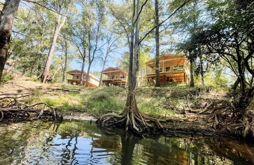 *NEW* Paddlewhacks is a group of 5 cabins nestled along the Big Cypress Bayou towards Caddo Lake. We are right on the water yet a one minute drive into Downtown Jefferson. Each cabin has 2 bedrooms, 1 bathroom, open concept living/dining areas, small kitchen, and a front patio. Every cabin comes with a canoe, paddles, life jackets, and access to our group firepit and private kayak ramp. We allow pets (up to 2) for a $125 flat fee.