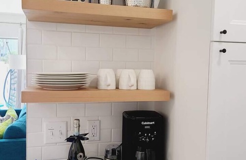 The first floor has plenty of room to spread out. The comfortable living room boasts a statement fireplace, sofa, and fun decor that is open to a dining area for four. We added a 4k smart TV so you can logon to any of your streaming services with our fast wifi and enjoy your favorite shows. The open kitchen offers full-sized appliances and is well-stocked for your meal prep. But do take advantage of all the awesome restaurants on the Island!