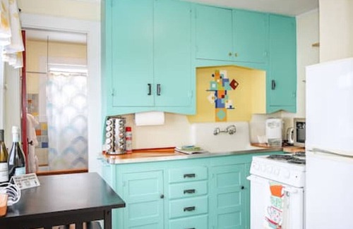 The kitchen is equipped with an oven/stove, microwave, sink, Keurig coffee maker with locally roasted Sorbenots Coffee, and a quaint eating nook for two. Curl up in the brand new queen-sized bed and enjoy a movie on our large smart TV, complete with a YouTube TV subscription. Guests are welcome to log into their own streaming accounts to watch their favorite shows and movies.