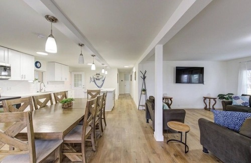 Fully stocked kitchen, open living with Smart TV and dining area--great for meal time.