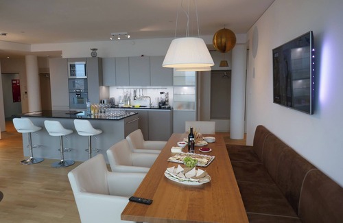 High-end living on 90-110 m2: The top-equipped panorama suites can be booked for 2 to 7 people, they are located on the 11th Floor with a view over Vienna and are serviced for the highest demands (weekly cleaning and laundry service).