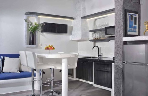 This superb maisonette's Mykonian & Cycladic details of white plaster walls with rounded edges and rustic features pay homage to ancient civilizations. Modern amenities and elements of luxury mean that you don't sacrifice comfort or space. From the private pool on the expansive patio and shaded outdoor dining to the well-appointed interiors, this home offers an unforgettable holiday stay less than five minutes from Panormo beach. A reverse floor plan (living areas are upstairs while bedrooms are downstairs) affords the best possible views from inside the house.
