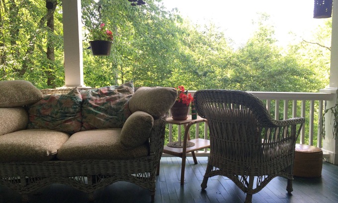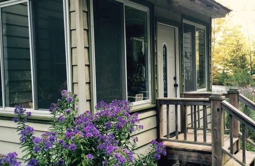 Dining seats 4 , Stove, Fridge, Freezer, Microwave, Toaster, Kettle, Dishwasher, Blender, Local Guides, Alarm Clock, TV, CD player, Wi-Fi, Hair dryer, Safe, Ceiling Fans, Shampoo Provided, Central heating, Air conditioning, Linen, Towels, Fan, Paper Towels Provided, Books, Mountain Views, Stream access from property, Landscaped grounds, Hummingbird Feeders, Bird feeders, Nearby Great Blue Heron nesting areas, Windchimes, Swing set/Playground, , BBQ, Nearby world class fishing, Parking, Wraparound Porch, Outdoor Dining, Hammock, Goldfish pond, Meditation areas, Firepit. Note there are honeybee hives on property.
