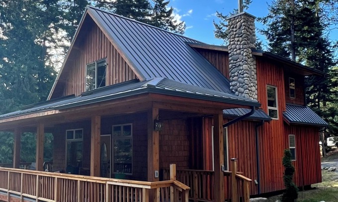 Located just 6 minutes from both the ferry and town, you'll enjoy easy access while still feeling worlds away. The expansive wrap-around covered porch—with skylights and soft lighting—offers the perfect place to sip coffee, share meals, or unwind in nature, rain or shine.