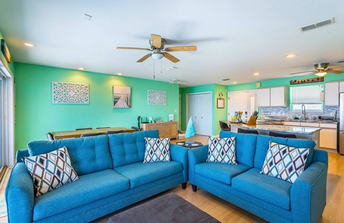 The open concept living area just past the kitchen island you will notice the coffee bar adjacent to the reclaimed wood accent wall and Large 65” Ultra high Definition 4k TV. The two love seats are equipped with new pull out twin sleeper beds. The Acacia wood Dining table seats 6 comfortably for dining or a game of cards after a long day on the beach.