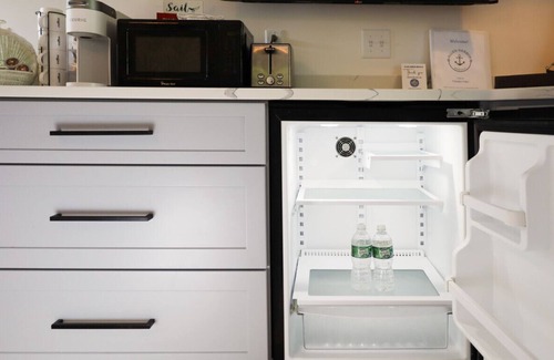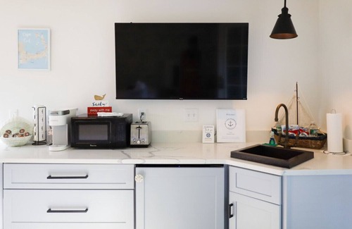 Enjoy this classic cape cod oasis directly across the street from Allen Harbor. This space has a private entrance with a table for 2, where you can sit, relax and enjoy the fresh air off the comfort of your room on the new patio. This is a newly renovated space that has a king size bed with kitchenette that is equipped with a microwave and Keurig for coffee. There is a flat screen T.V. on the wall and a mini split A.C. unit and heat. Lastly, a brand new walk in shower with rain head. Linen and towels are provided.