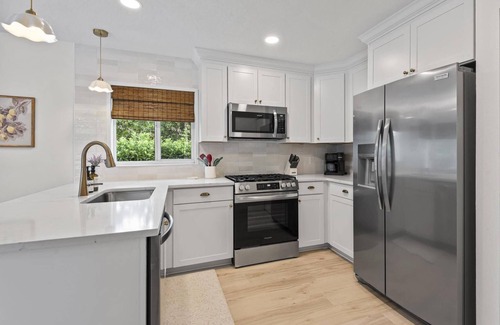 The Kitchen: The sleek, modern kitchen is fully equipped with stainless steel appliances, cookware, and everything you need to create memorable meals. Enjoy breakfast in the sunny nook that opens to the pool area—an inviting spot to start your day.
