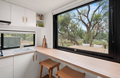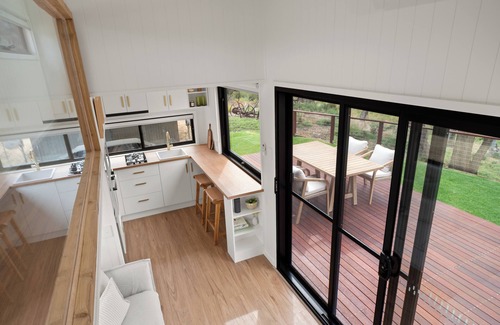 The tiny house is fully self-contained and includes a well stocked kitchen for all your cooking needs, including two-burner gas cooktop, electric oven, microwave, kettle, toaster, bakeware, utensils, fridge/freezer, cocktail accessories and Nespresso pod machine.