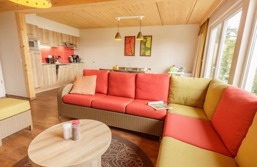 Child friendly resort "Park Bostalsee". Outside the resort, 10 km from the centre of Nohfelden, on a slope, on the lake, on the beach, in the countryside, in the woods. For shared use: indoor pool heated. Shower/WC in the pool area, children's pool, slide, hot tub, tennis (extra), basketball, volleyball court, beach volleyball, children's playground. In the complex: reception, restaurant, bar, breakfast room, sauna (extra). Massage (extra). Spa area (extra) table tennis, billiard table, trampoline, shopping facilities, bicycle rental. Available: bowling (extra). Breakfast possible (extra). Central parking spaces. Railway station "Türkismühle" 7 km. Golf course (9 hole) 8 km. Nearby attractions: Nahequelle mit Wildfreigehege, Sternenwarte Peterberg, Strasse der Skulpturen. Please note: car-free holiday complex. The owner does not accept any youth groups. Fishing [permit required] (extra). Loading and unloading of baggage is possible at the holiday house. The photograph shows a typical example. All houses/apartments are individually designed/furnished. The holiday park with terraced houses in timber construction (some with lake view) is located directly on the 120 ha large reservoir "Bostalsee", a paradise for swimmers, sailors and windsurfers. The focal point of the complex is the covered "Market Dome" with various restaurants, panoramic terrace overlooking the beach and lake, shops, House of Games and the children's activity program "Wannabe". In the subtropical water paradise "Aqua Mundo" (free of charge) with indoor and outdoor pools, slides (up to 130 m) and wave pool nothing to be desired. Sports arena, archery, mini golf, pony riding and boules are other parts of the extensive recreational activities. Facilities partly extra. Pedal and electric boat rental (extra).