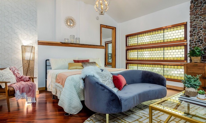 Park Suite is the most romantic room on the property - it has a king-sized bed, cobblestone fireplace, and the most incredible bathroom you've ever seen. Cobblestone archways and stained glass line this room to make it feel like a piece of art in and of itself. The room has direct access to a private outdoor space. Upon entering the bathroom you can either go to the toilet room and experience the bidet or you can take a right and lounge in the garden tub or take a shower where the water falls from the sky...sprays from the wall...and from the hand sprayer in case anything gets missed! A truly incredible showering experience.