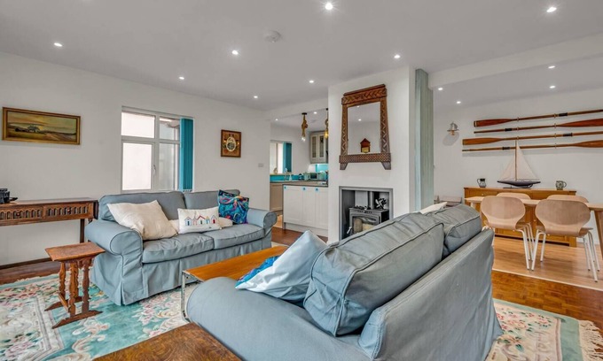 As you enter the property, you'll be greeted by panoramic sea views that can be enjoyed from the front room sitting by the log burner. The large windows allow natural light to flood the space. The interior design of the property has been carefully curated to reflect the coastal theme, ensuring a high standard of aesthetics and comfort.