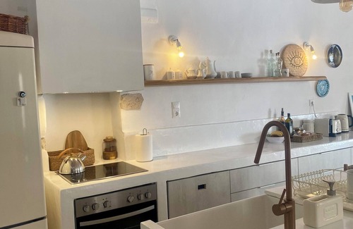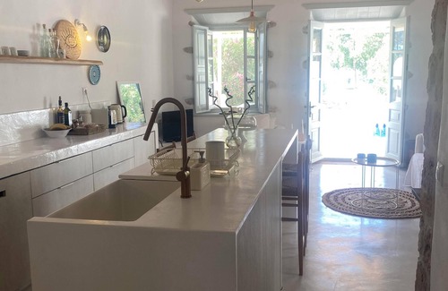 A stone house on the beach of Sapsila with an astonishing view, minimal luxury and great atmosphere in a perfect accordance to the island's traditional architecture the ideal place for a slow living approach. About 900 m. from the main port (Skala) the stone villa offers warm hospitality and the priviledge to be just a breath away from the sandy beach just 15meters away! It is designed in a way that offers one of a kind comfort!