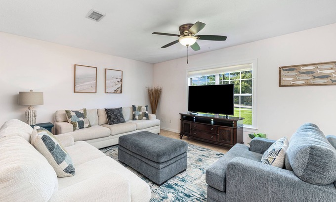 Enjoy backyard fun with a propane grill (propane and utensils included) and a shaded outdoor seating area. Stay connected with ultra-fast WiFi and stream your favorite shows on smart TVs in both bedrooms, including access to YouTube TV. The laundry room is equipped with a washer, dryer, and detergent, and beach towels are provided.