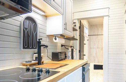 The kitchenette is fully stocked with essentials: stovetop, toaster oven (no full oven), microwave, Keurig, fridge, dishwasher, and cookware. A full-size washer and dryer are also included.