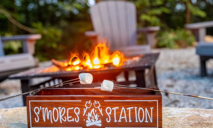 Step outside to the upper deck, where café seating and bistro lights invite you to play cards, sip wine, or stargaze surrounded by treetops. Toward the back of the cabin, you’ll find a peaceful fire pit area with Adirondack chairs—perfect for roasting marshmallows and enjoying quiet moments in nature.