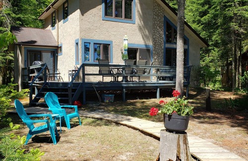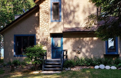 The master bedroom on the main floor, with TV, has a patio door view of the lake and an adjacent full bath. 2 bedrooms on the upper level with 3/4 bath between include 1 queen size bed on the lakeside with a wonderful view of the lake and the other bedroom has two extra long twin beds which can be combined to make one king bed. Fully equipped kitchen includes range, fridge, built-in dishwasher, microwave, coffee maker and other small appliances. Washer & dryer are also available.