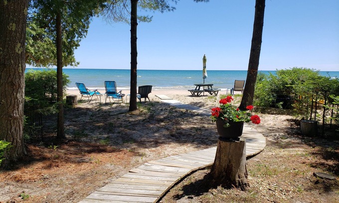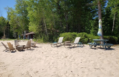 Beach area has lounge chairs, fire pit, picnic table with umbrella, hammock, child's swing and two kayaks for your use. Altogether, a touch of paradise.