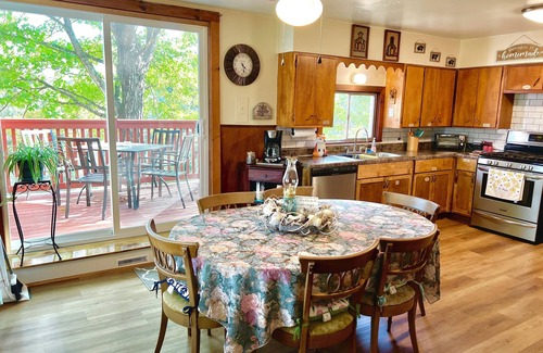Inside the cottage, our kitchen/dining room is spacious with gorgeous views of the property. The kitchen contains natural wood cabinets and a full set of stainless-steel appliances, including dishwasher, microwave, toaster, toaster oven & garbage disposal. You will have plenty of counter space to prepare meals & snacks as well as being stocked with what you may need to cook a meal. Outdoor dining is available on the deck or under our covered picnic area, Edison/Bluetooth string lights with speakers provided and charcoal grill. Entertainment provided; Mini cornhole and mini washer games as well as many board and card games.