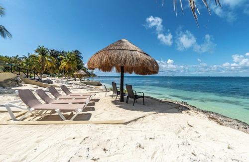Located on the west side of Isla Mujeres overlooking the turquoise waters of Cancun bay . Enjoy beautiful sunsets and the twinkling lights of Cancun from our beach.There are restaurants within walking distance. Guests can arrive, depart or be picked by boat at our private on the lagoon.