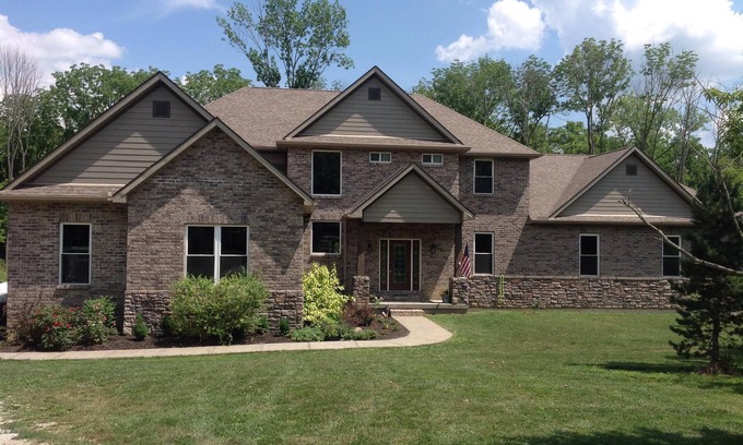 Amazing house in the middle of a Christmas Tree Farm. Perfect for family reunions, company picnics, getaway trips, guy/girl weekend, rehearsal dinners or even small weddings. Only an hour from Arc Encounter/Creation Museam. This place has everything.... 1000 square foot Indoor basketball court with 22 foot ceilings, outdoor sand volleyball court, inground pool with automatic cover for safety, outdoor kitchen in pool area with a wood fire pizza oven, 10 acres of sprawling country and for complete privacy the house is set 1/4 mile off the road hidden by trees. Lots of room to move in the 6000 square foot home. Open floor plan with a large eat in kitchen that is fully equipped with stainless stain appliances. The entire backside of the main floor has large windows to enjoy the amazing forest view. There is a 400 square foot back patio off of the living room/kitchen. There is a second living room in basement that is equipped with 3 flat screen TV's so you will never miss a play of your favorite game. You can also enjoy a foosball game or get a good work out in the large basement. There is a walk out to the pool and patio. Six bedrooms and five full baths throughout the house. The master suite has a king size bed, dual head walk in shower and a jacuzzi tub. We are located 15 minutes from ATP Tennis Center, Kings Island and The Beach water park. 7 minutes from historic Lebanon. 25 minutes from downtown Dayton and 35 minutes from downtown Cincinnati. You will LOVE this place