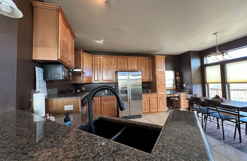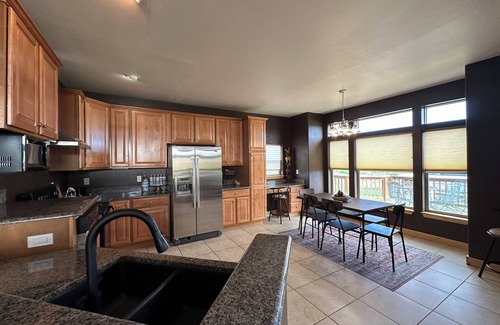 Inside, enjoy the gas fireplace, central air conditioning, and high-speed internet, ensuring a cozy and convenient stay. The fully equipped kitchen features elegant granite countertops, while the dining area is perfect for gathering over meals.