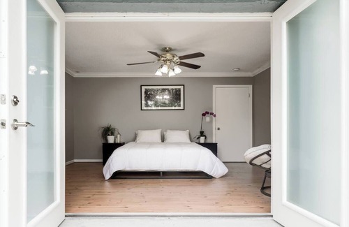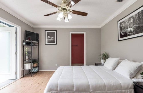 Come relax and unwind on a micro-farm! This cozy room has a private entrance with a queen size bed, a comfy sitting area, microwave, refrigerator/ freezer, dinette, T.V wifi, and a private bathroom. The extensive outdoor area includes a screened-in pool and is nestled in a 2-acre, permaculture food forest with 100s of fruit trees, chickens, honey hives, and birds and butterflies. The location is close to natural parks and grocery stores and is a short drive to the beach, shopping, restaurants.