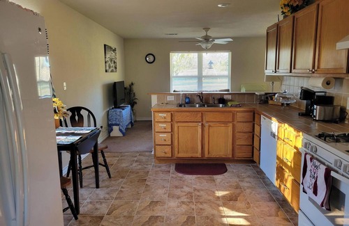 Sparrow Nest is conveniently located off Hwy 121 within 30 minutes of Mckinney, Blue Ridge, Bonham, Trenton, Leonard, and Whitewright. It boasts 2 inviting bedrooms; 1 full bed and 1 queen bed respectively. Guests can enjoy amenities like a fully stocked kitchen, fenced backyard with a doggy door, washing machine/dryer, AC, WiFi, and all the comforts of home. The view from the rocking chairs on the front porch shows flower gardens, a vegetable garden, and wide open fields, The view out the back yard shows forest and flower beds and room for your furbaby to run.