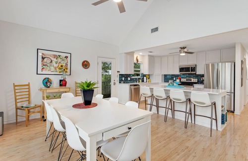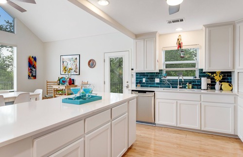 The beautiful Texas Hill Country surrounds this chic home. You'll be located one mile from Flat Creek Winery, an award-winning Texas winery that features bistro dining, wine tasting, and beautiful hill country views. There is a public boat ramp four miles down the road, and the nearest grocery store is in Lago Vista, just 11 miles away. This home is on a bird migration path, and you can see various beautiful birds come through. You're also just a short drive from Austin, the state capital of Texas and the Live Music Capital of the World.