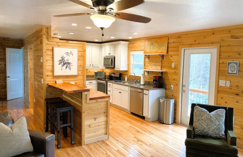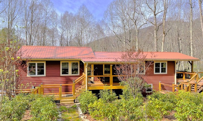 Nestled at the foot of Crabtree Bald and surrounded by trees and rhododendron, this 2BR/2BA mountain home offers a peaceful, park-like setting with 2 access points to Bald Creek.