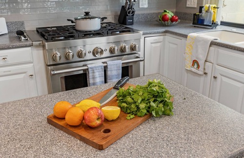 The gorgeous kitchen has brand new designer appliances and everything else you need to cook a fabulous meal with family and friends or just make a perfect cup of coffee in the morning to make you feel home. There is plenty of room for cooking with a center island, vast counter space, 6 burners professional range, oven, fridge/freezer, microwave, coffee/tea bar, toaster, blender, and ultra quiet dishwasher. Enjoy a hot cup of coffee on island bar stools, bistro table, or out on the deck in the fresh air.